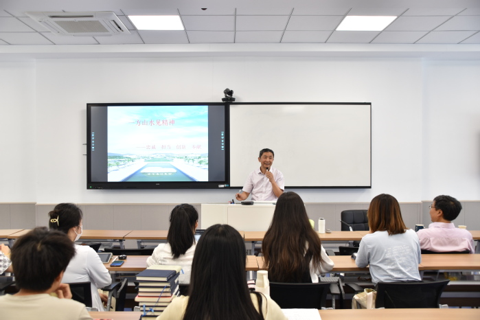 郭宏之向同学们介绍浦口校区的建设理念,深入阐述了浦口校区的建筑设计灵魂——“人,诗意的栖居”。他用经典诗句描绘校园里的每一个角落,指出南审校园聚散有序、动静有别、交往有利、四季有美、情思有归的匠心独具,概括出“一座校园,诗意为因;两所学校,依审而兴;三大理念,开拓创新;四方共建,铸魂润心;五大职能,不畏艰辛;六园同辉,广阔胸襟;七星拱月,道贯古今;八字校训,践行初心”的新校区场所精神,这一物化的实体空间铸就的场所精神将影响一代代学子,薪火相传。